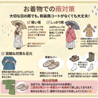 着物お役立ち情報 お着物での雨対策 さて本日は、「お着物での雨対策」について。 春は雨が多いシーズン。入学式など大切なお出かけ日に雨…ということもありますよね。 和装用の雨コートがなくても大丈夫です!✔軽い雨100均などで手に入るレインスカートで裾周りをしっかりカバー。※必ず... 2026.03.31 着物お役立ち情報